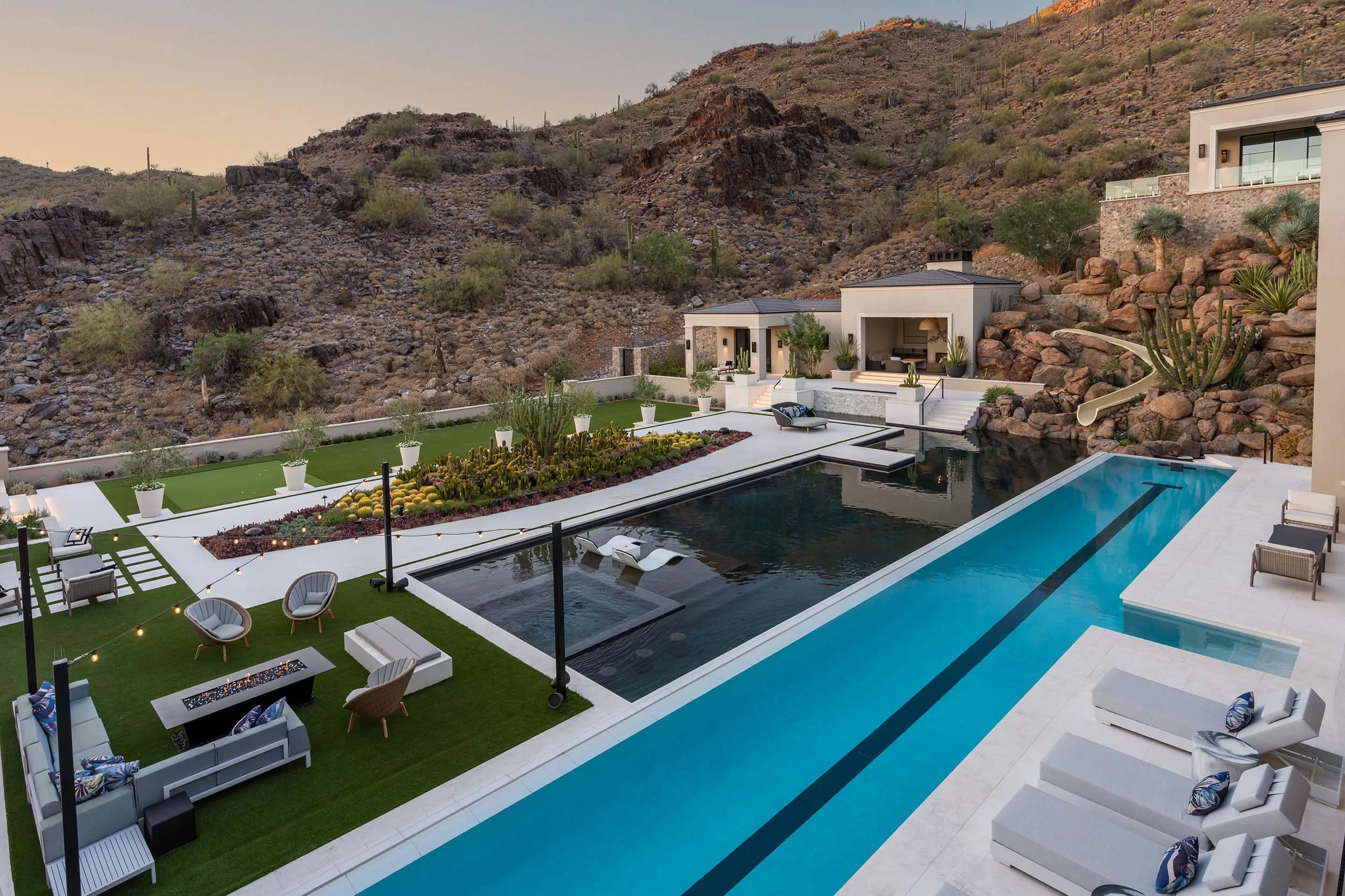 High in a canyon overlooking the Scottsdale skyline, this residence embodies the perfect balance of strength, sophistication, and purpose. Designed by Scott Carson, with interiors by Michael Fergeson and landscape architecture by Greey Pickett Design, the home was crafted for clients whose passion for triathlons inspired every detail. The expansive wellness suite includes a professional lap pool, sport pool, hot yoga studio, gym, sauna, steam, and massage room—each space designed for performance and recovery. A private stair tower leads to his elevated office, where sweeping views capture both the home and the city below. From this rare vantage point, planes on final approach to Scottsdale Airport pass beneath the property’s elevation, offering a truly remarkable perspective.