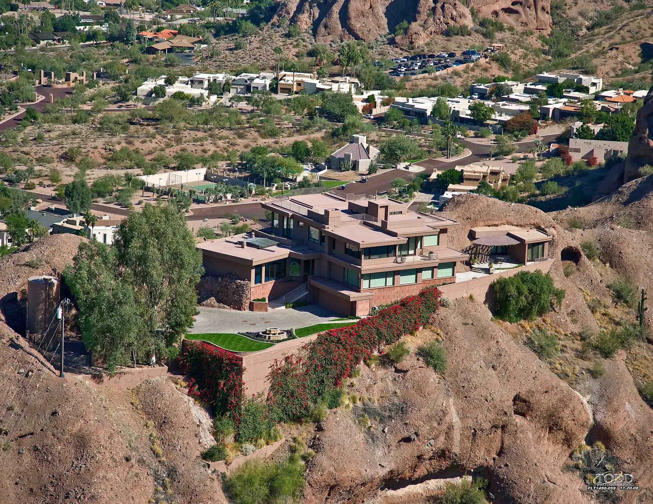 Perched atop the highest lot on Camelback Mountain, this extraordinary residence offers sweeping, uninterrupted views that stretch endlessly across the valley. The home features an indoor swimming pool with a retractable roof that opens to the night sky, creating a truly unique experience. An expansive rooftop deck provides space for entertaining and large gatherings, while a guest house built into the mountain’s natural cave offers an unforgettable retreat for visitors. Upon arrival, guests pass through a dramatic crevasse in the rock to a motor court carved directly into the mountain. An elevator connects the lower-level garage to the home’s multiple stories, rising four levels to the rooftop terrace, where the desert landscape unfolds in every direction.